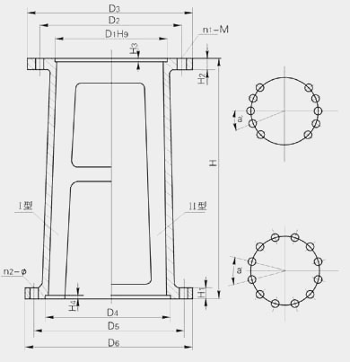注:WJ型、DJ型、DXJ型-30A/B、35A、40B、45A四種機架底面為Ⅰ型和Ⅱ型(Ⅰ型不須標柱,Ⅱ型須在型號后面注Ⅱ、Ⅱ型a°=30°,n2-φ為12-14)其余機架為Ⅱ型(不須標注)